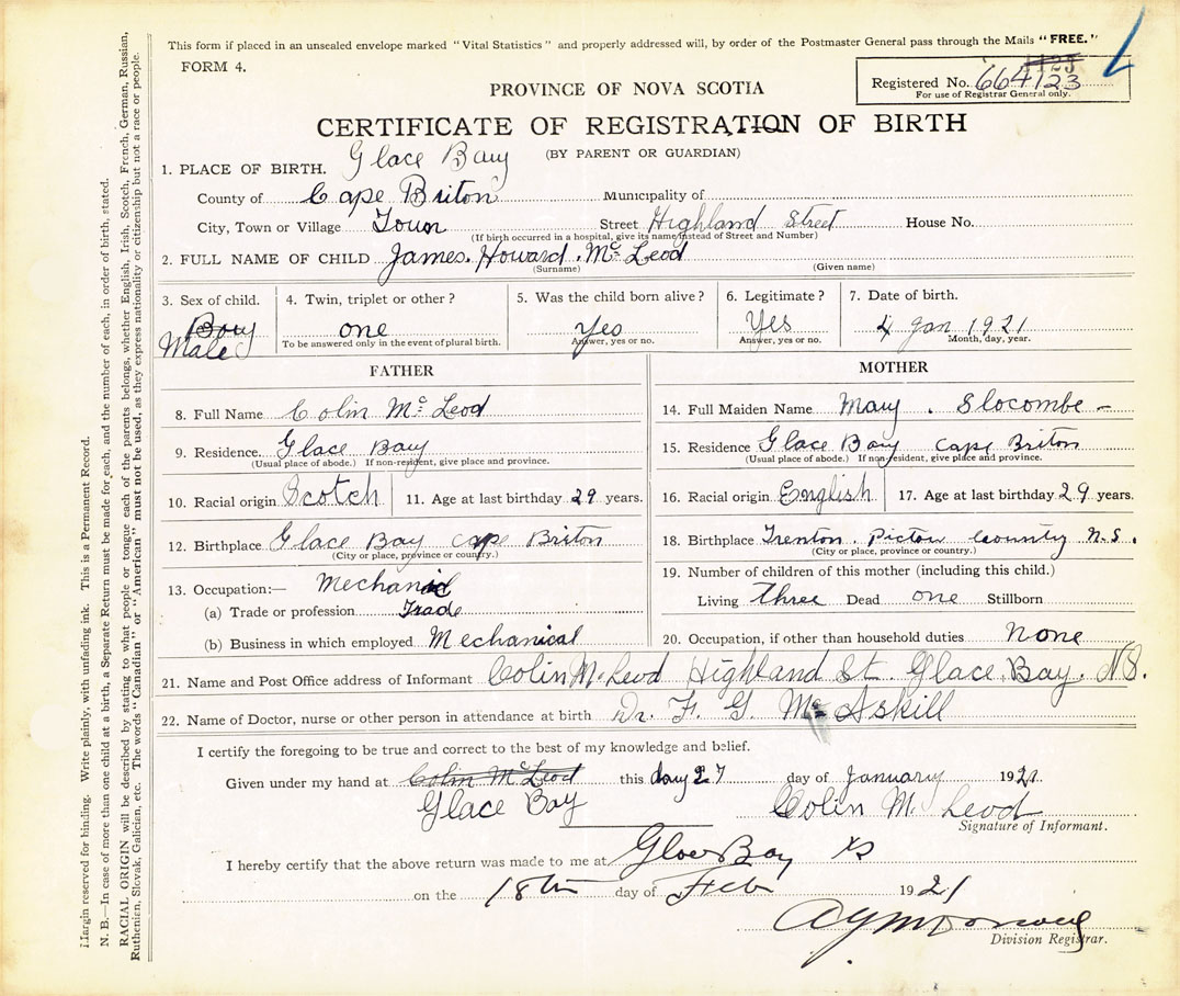 21. Name and Post Office address of Informant Colin McLeod Highland St. Glace Bay