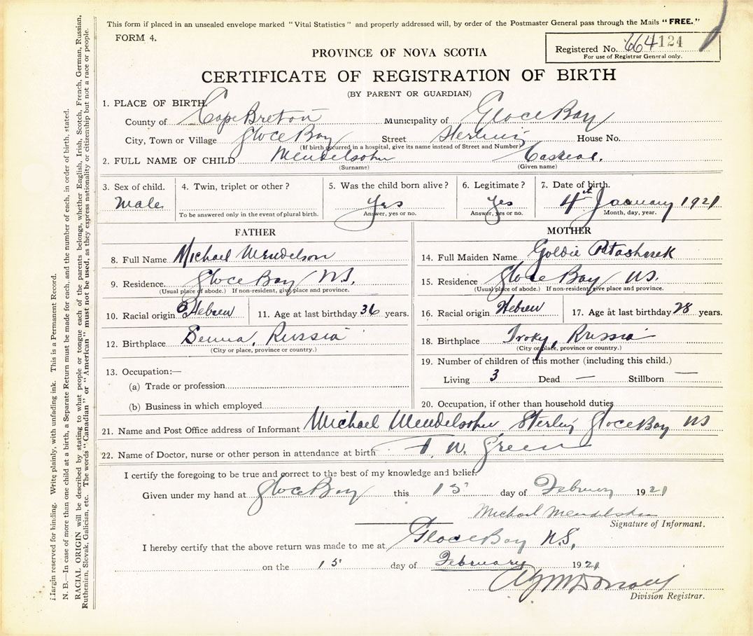 21. Name and Post Office address of Informant Michael Mendelson Sterling, Glace Bay, Cape Breton