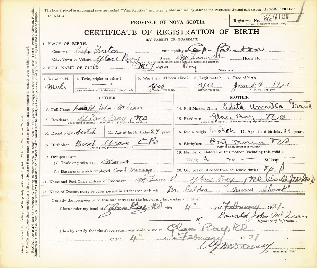 21. Name and Post Office address of Informant Donald Jackson McLean Street, Glace Bay, Cape Breton