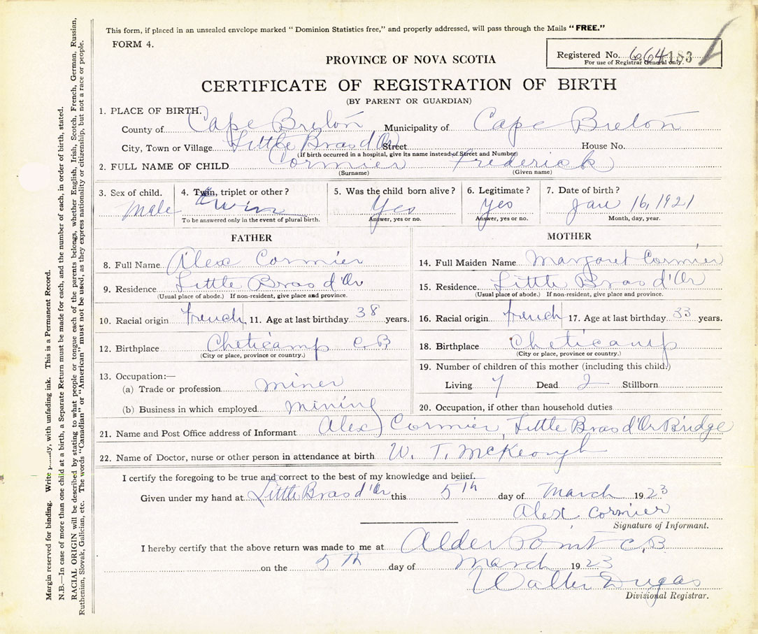 21. Name and Post Office address of Informant Alex Cormier Little Bras d'Or, Cape Breton