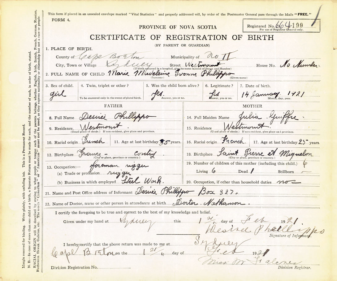 21. Name and Post Office address of Informant Desiree Phillippo Box 327, Westmount, Sydney, Cape Breton