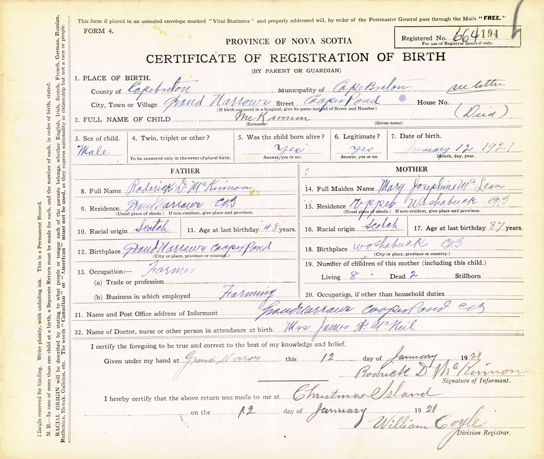 21. Name and Post Office address of Informant Roderick D. McKinnon Cooper Pond, Grand Narrows, Cape Breton