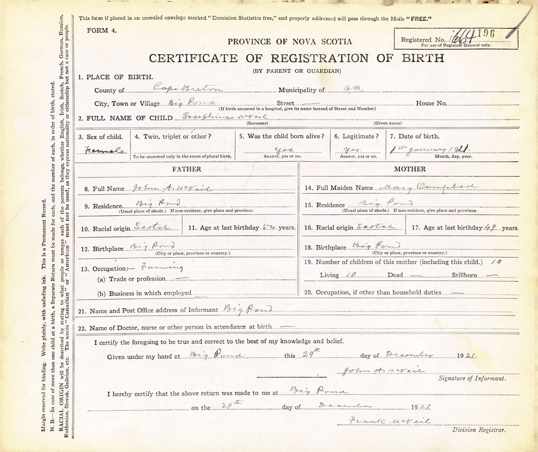 21. Name and Post Office address of Informant Big Pond, Cape Breton