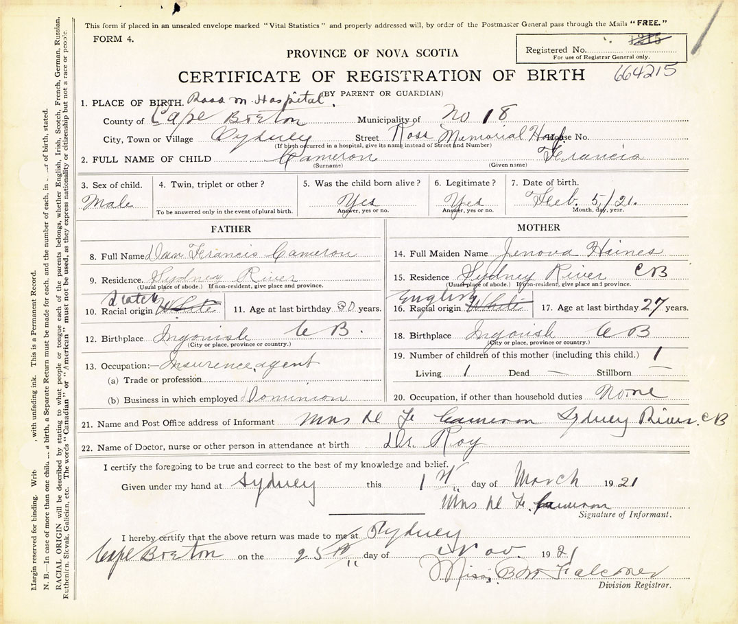 21. Name and Post Office address of Informant Mrs. D. F. Cameron Sydney River, Cape Breton