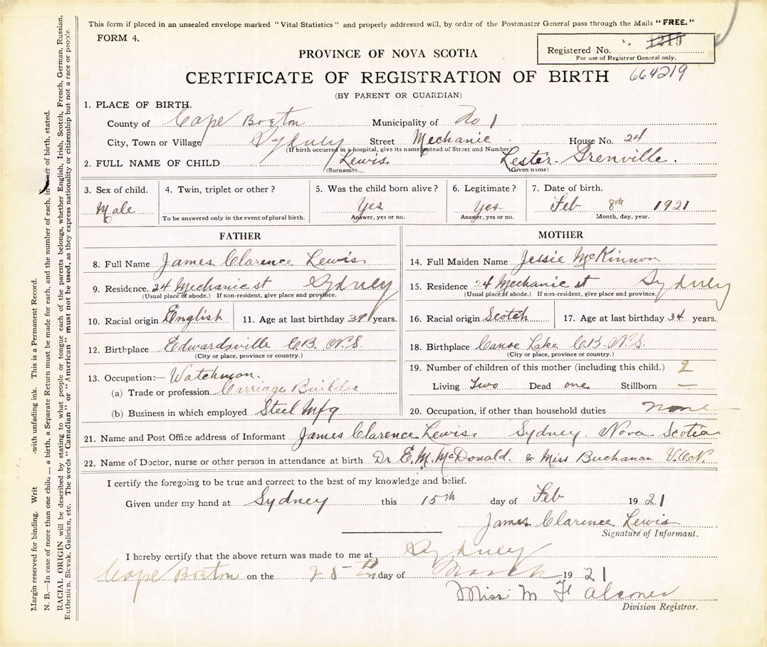 21. Name and Post Office address of Informant James Clarence Lewis Sydney, Cape Breton