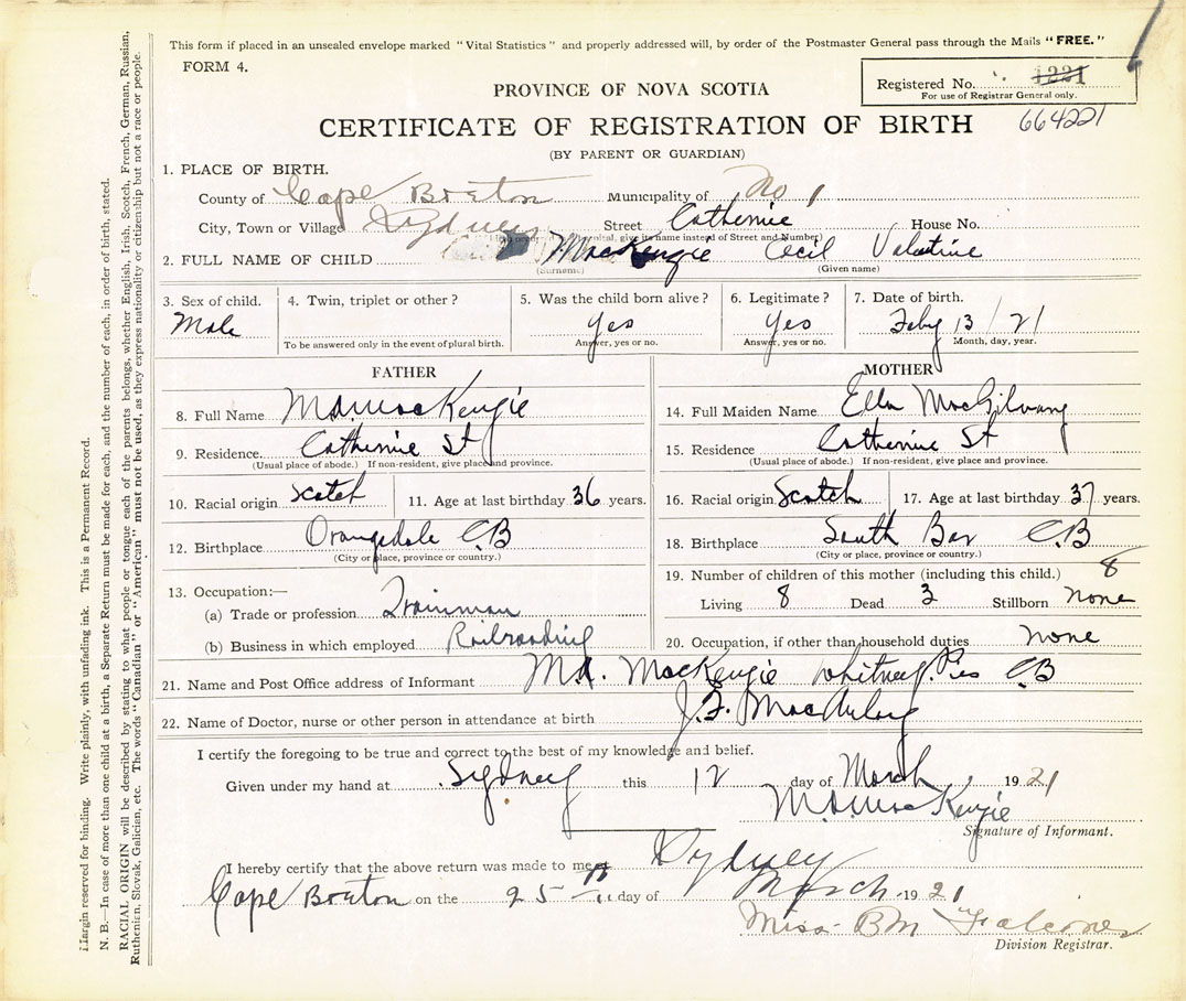 21. Name and Post Office address of Informant M. A. MacKenzie Whitney Pier, Sydney, Cape Breton