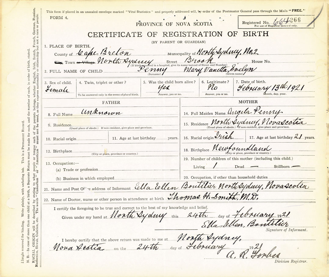 21. Name and Post Office address of Informant Ella Ellen Boutilier North Sydney