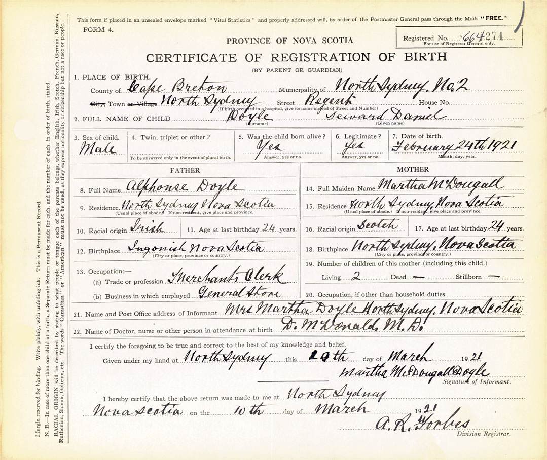 21. Name and Post Office address of Informant Mrs. Martha Doyle North Sydney, NOva Scotia
