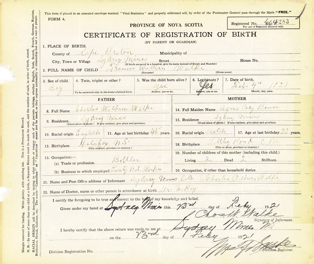 21. Name and Post Office address of Informant Charles Welburn Walke Sydney Mines, Cape Breton