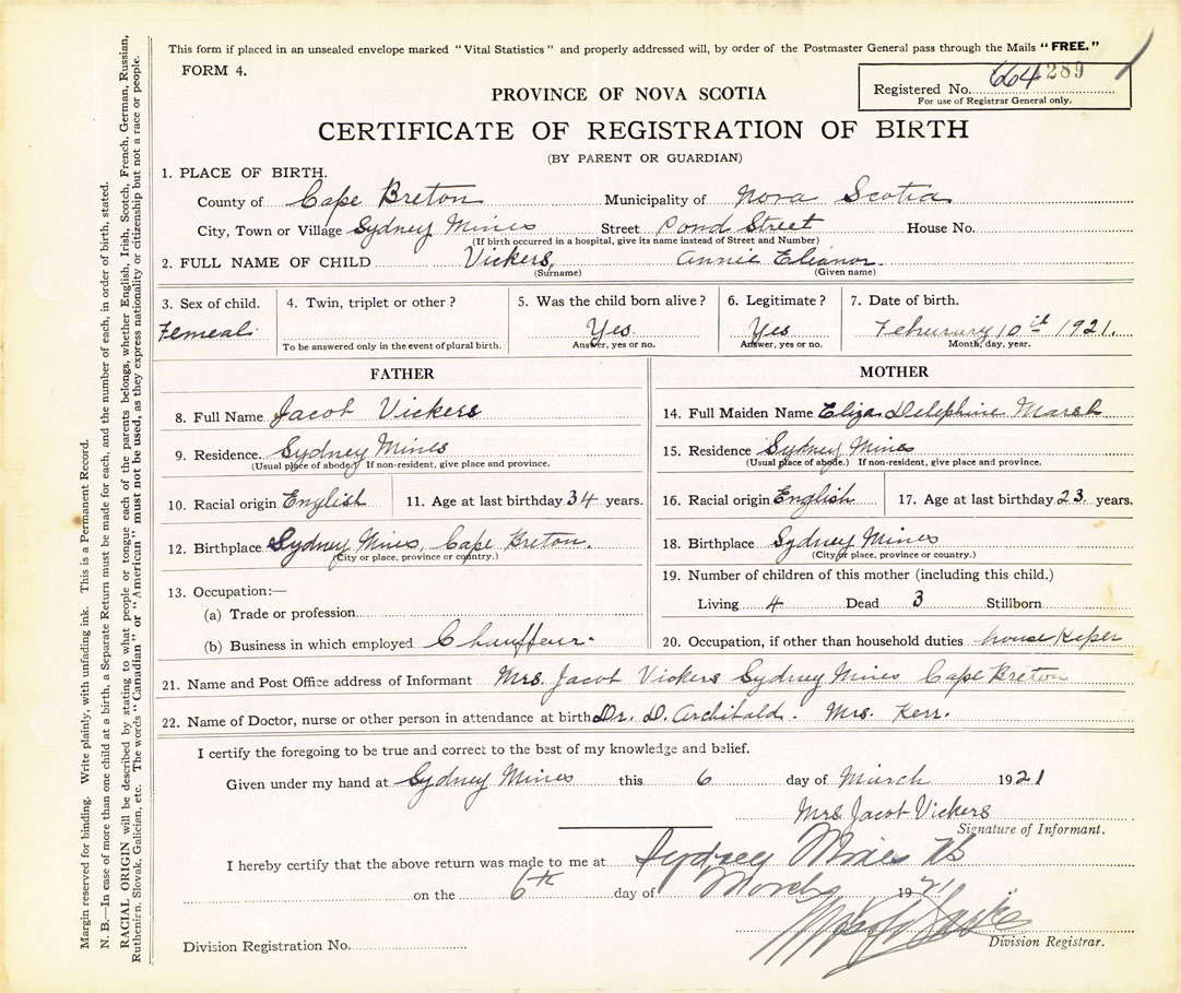 21. Name and Post Office address of Informant Mrs. Jacob Vickers Sydney Mines, Cape Breton
