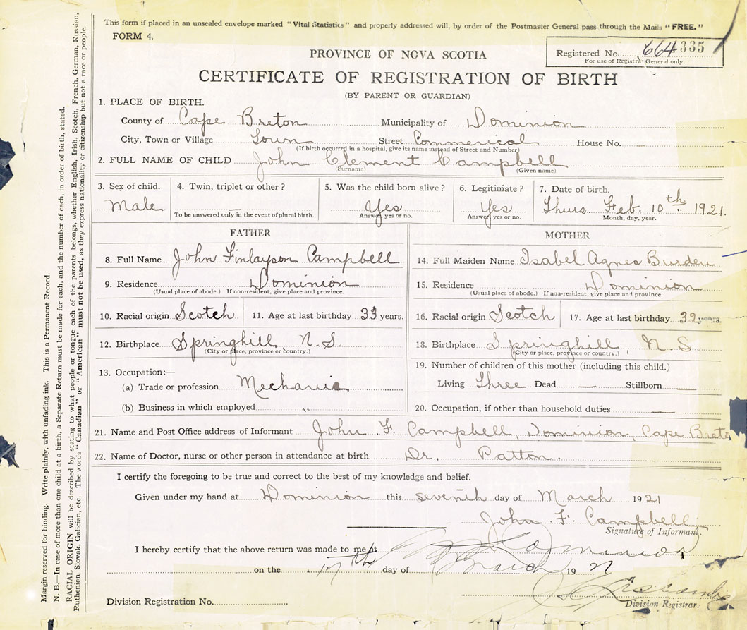 21. Name and Post Office address of Informant John F Campbell Dominion, Cape Breton