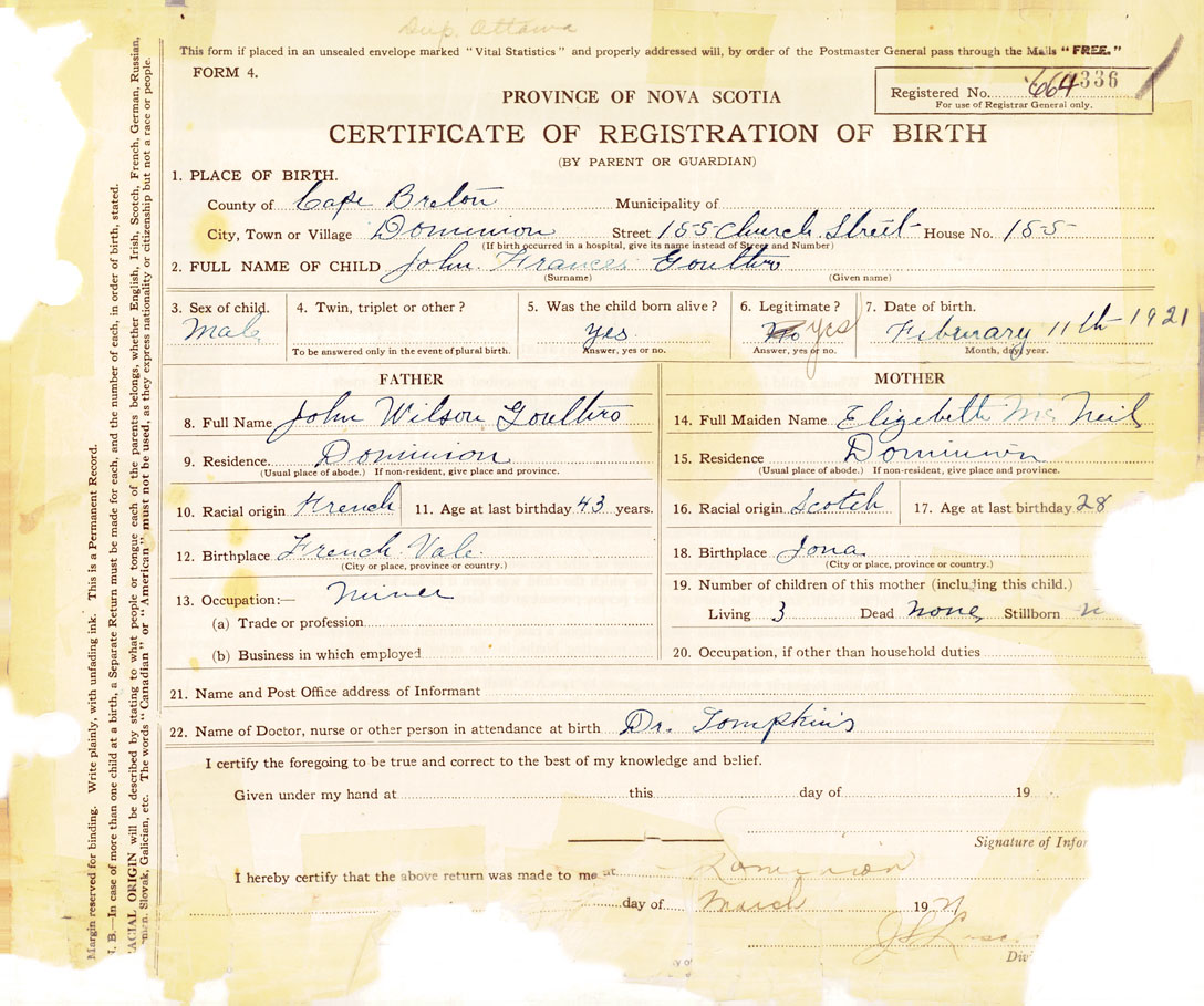2. FULL NAME OF CHILD Gouthro, John Frances