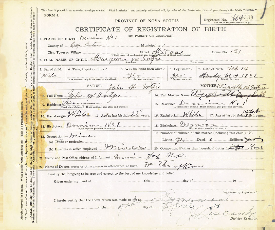 21. Name and Post Office address of Informant Dominion, Cape Breton