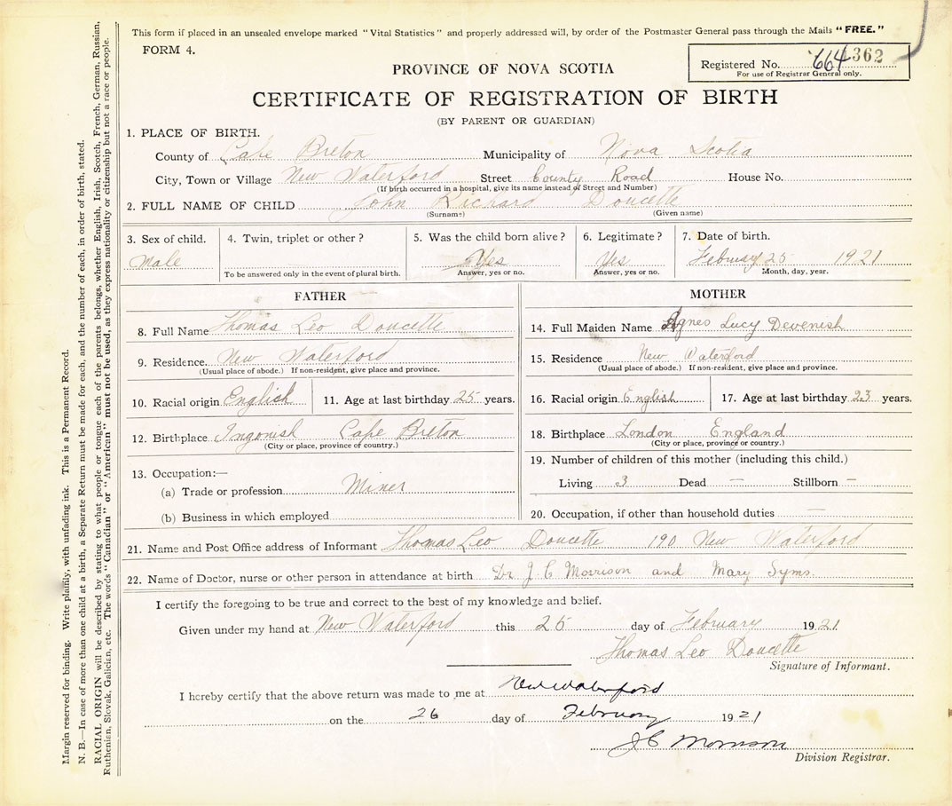 21. Name and Post Office address of Informant Thomas Leo Doucette 190 New Waterford
