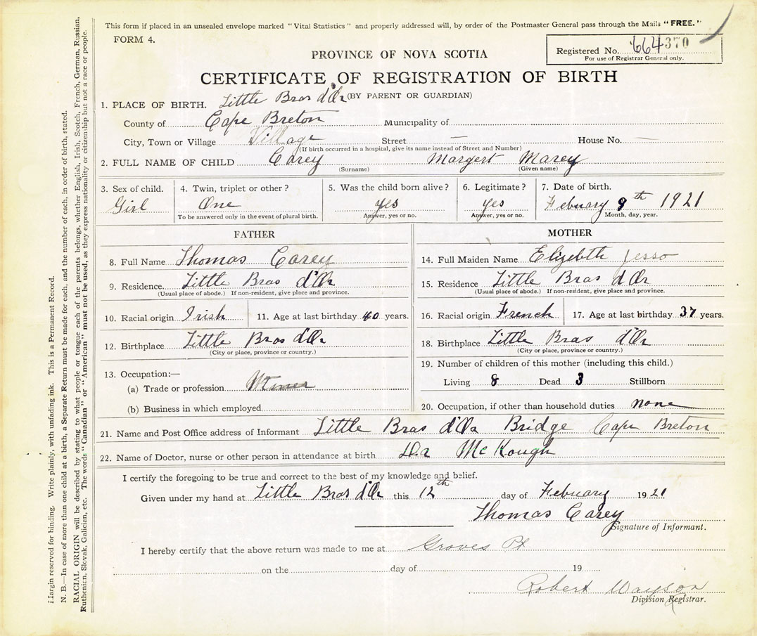 21. Name and Post Office address of Informant Little Bras d'Or Bridge Cape Breton
