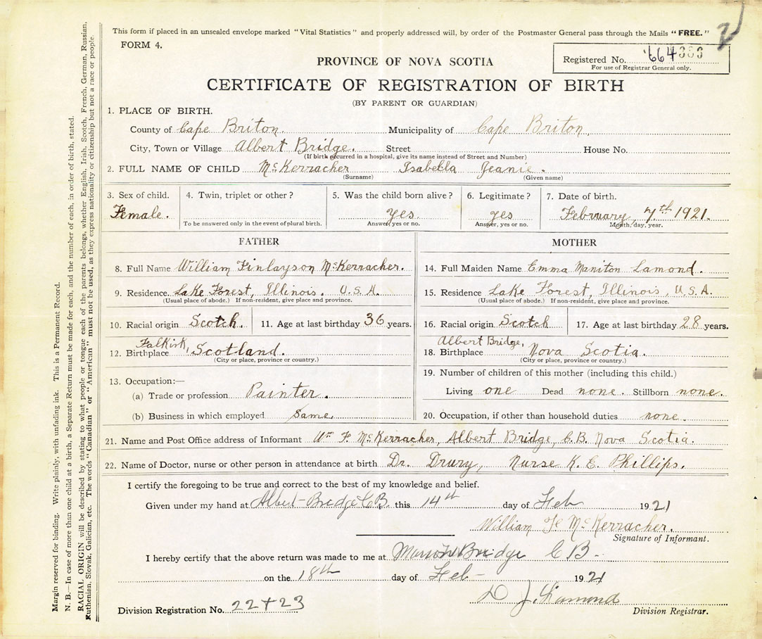 21. Name and Post Office address of Informant Wm F McKerracher Albert Bridge, C.B. Nova Scotia