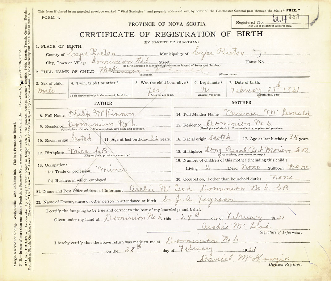 21. Name and Post Office address of Informant Archie McLeod Dominion No. 6, Cape Breton