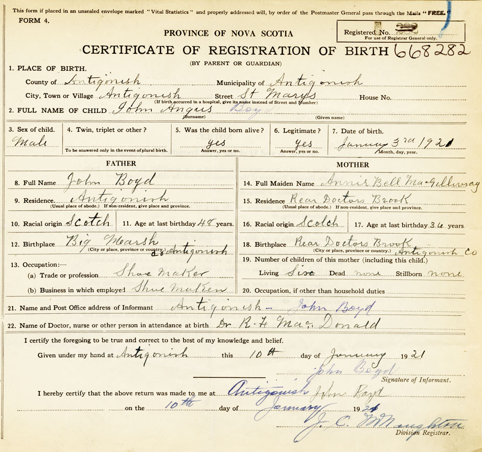 21. Name and Post Office address of Informant John Boyd Antigonish