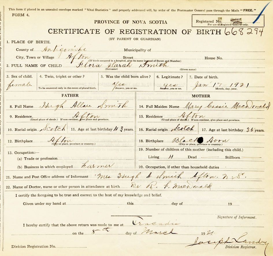 21. Name and Post Office address of Informant Mrs Hugh A Smith Afton N.S.