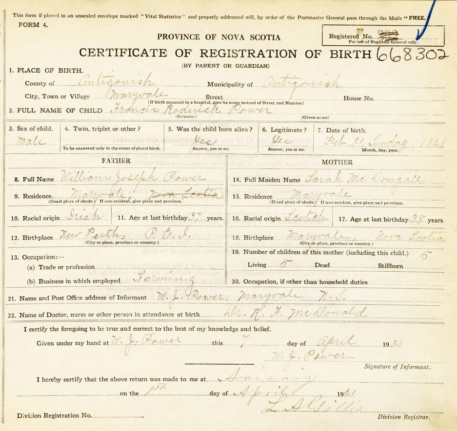 21. Name and Post Office address of Informant W. J. Power Maryvale, N..S.