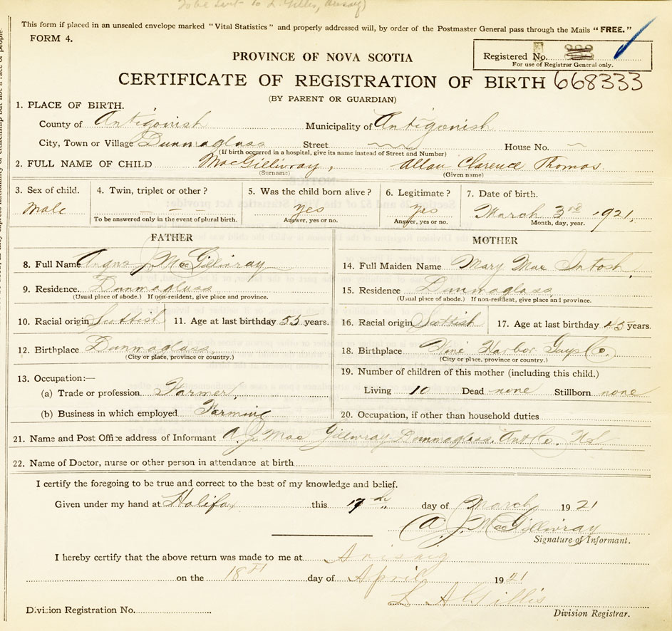 21. Name and Post Office address of Informant A. J. MacGillivrau Dunmaglass, Antigonish