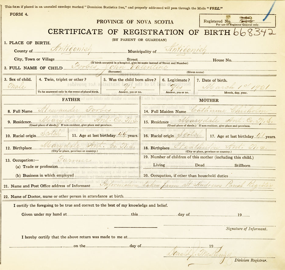 12. Birthplace Marydale, Antigonish Co., N S