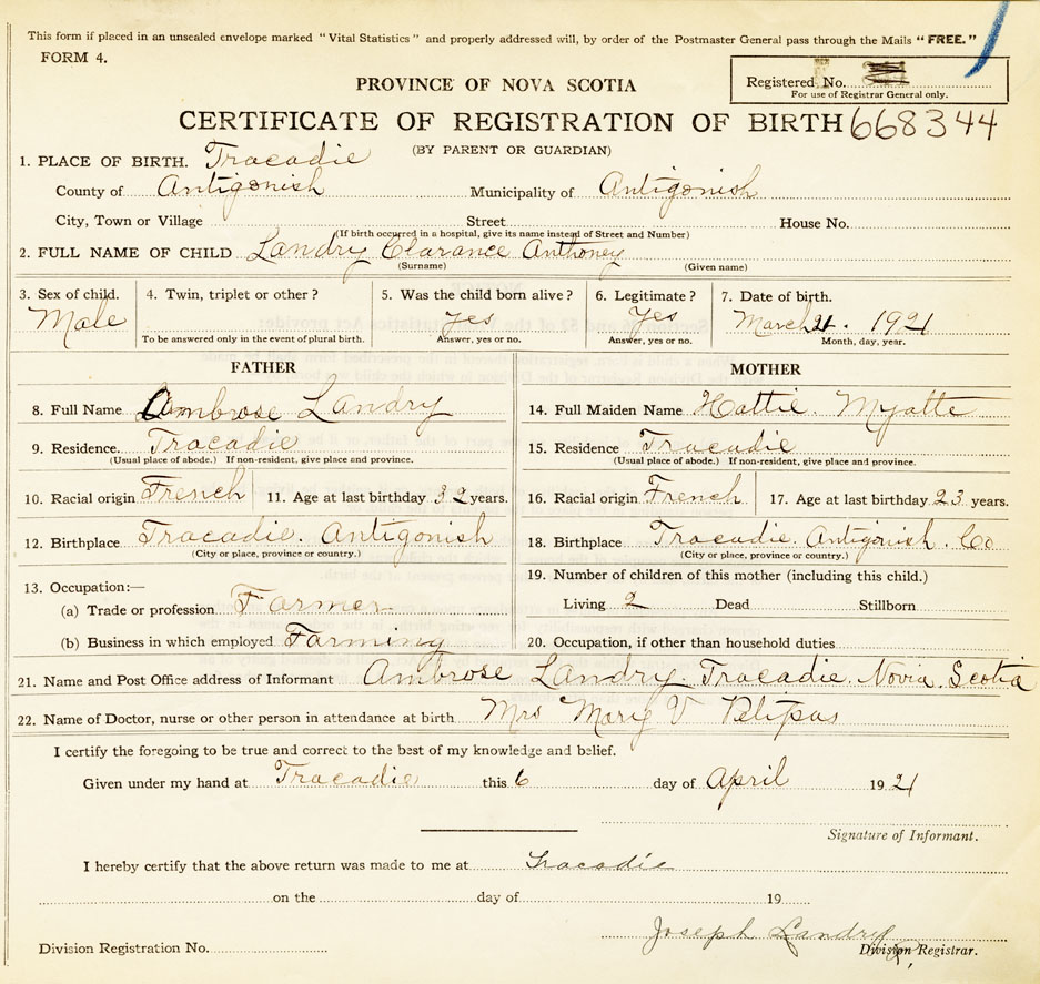 21. Name and Post Office address of Informant Ambrose Landry Tracadie, NOva Scotia