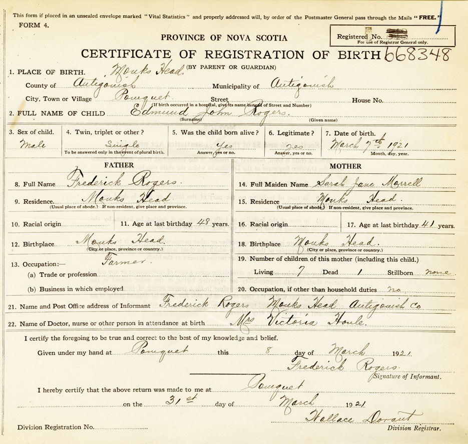 21. Name and Post Office address of Informant Frederick Rogers Monks Head, Antigonish