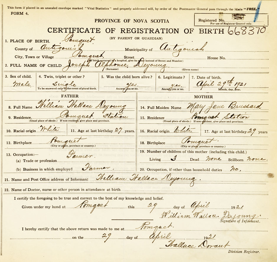 21. Name and Post Office address of Informant William Wallace Deyoung Pomquet Station