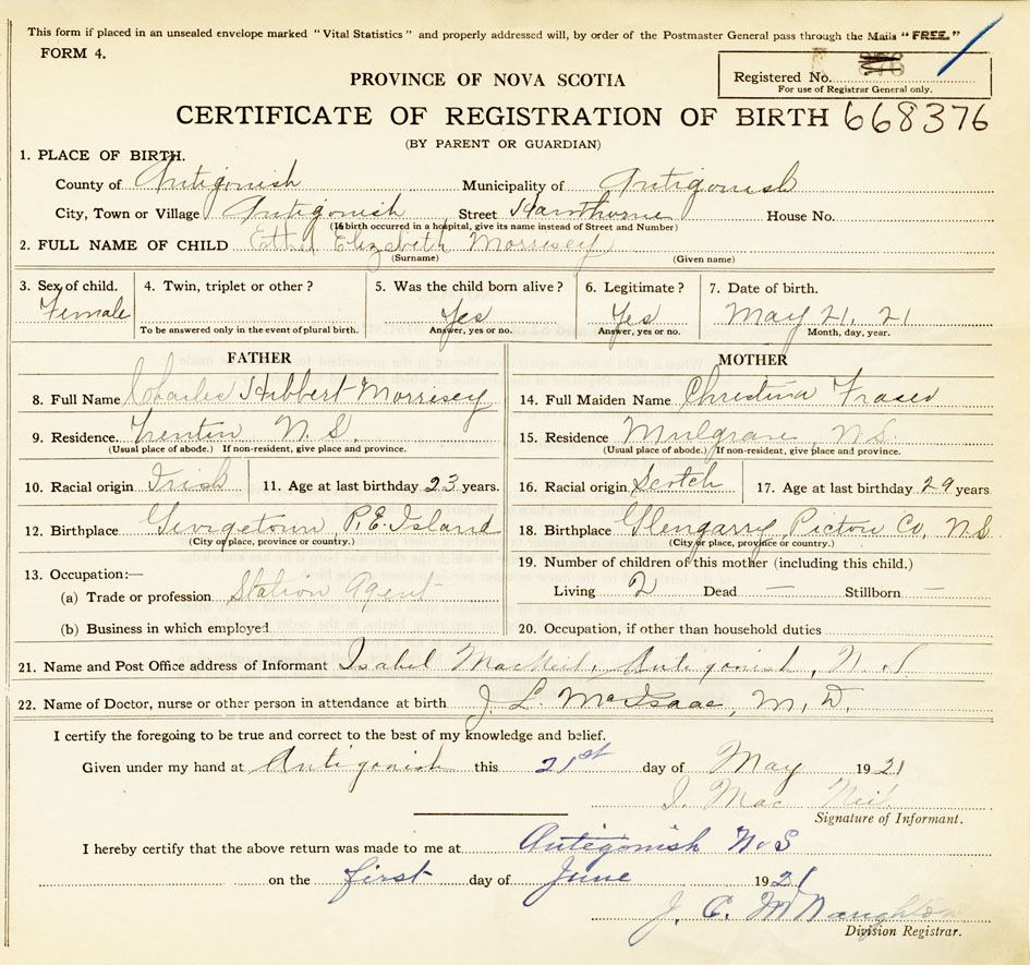 21. Name and Post Office address of Informant Isabel MacNeil Antigonish