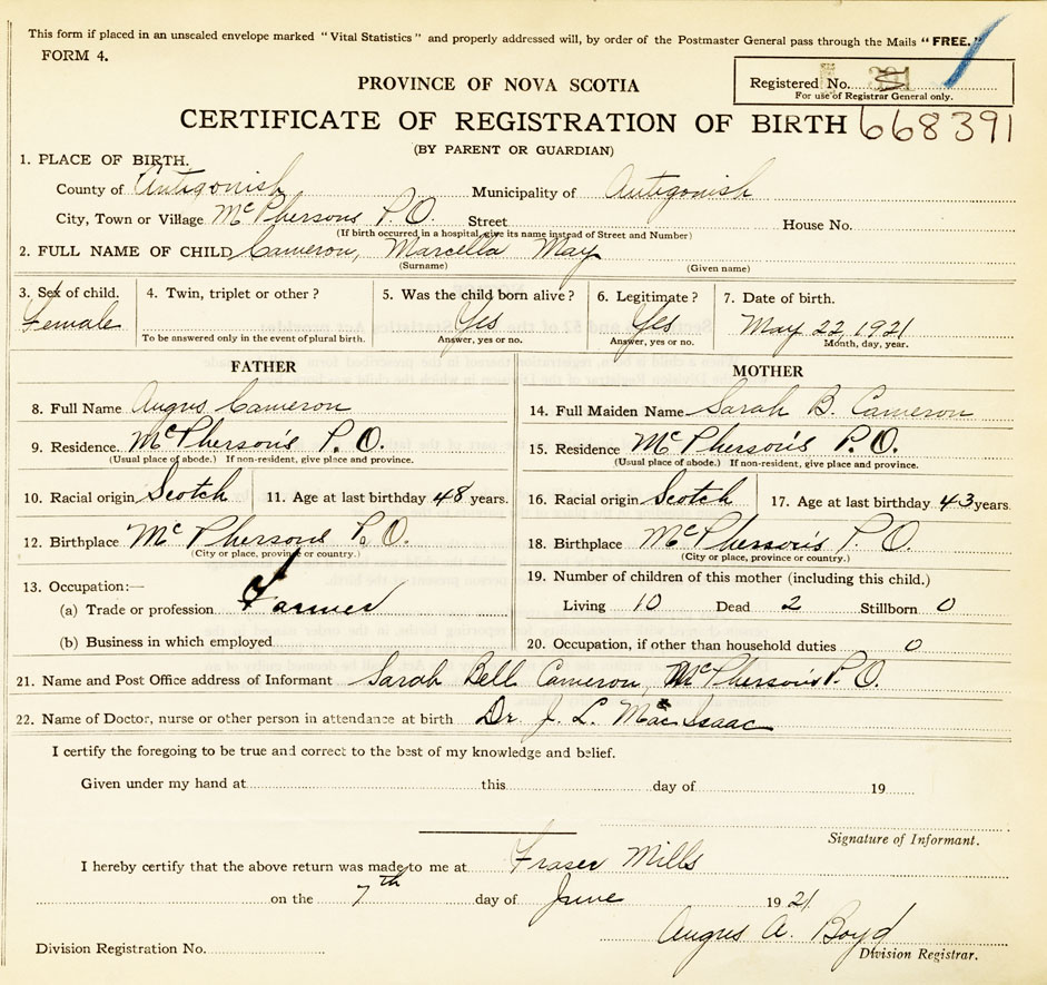 22. Name of Doctor, nurse or other person in attendance at birth Dr. J.L. MacIsaac