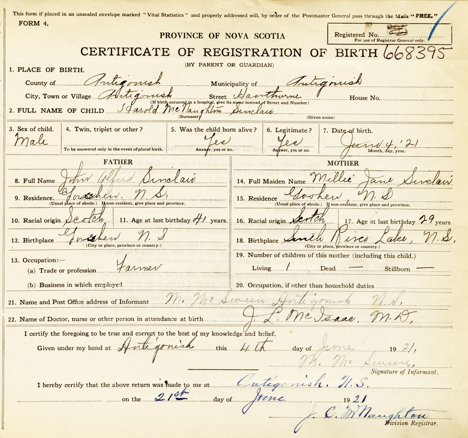 2. FULL NAME OF CHILD Sinclair, Harold McNaughton