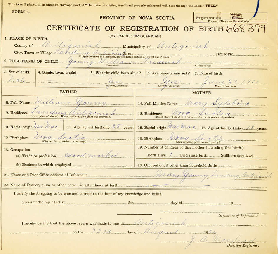 21. Name and Post Office address of Informant Mary Young Landing, Antigonish