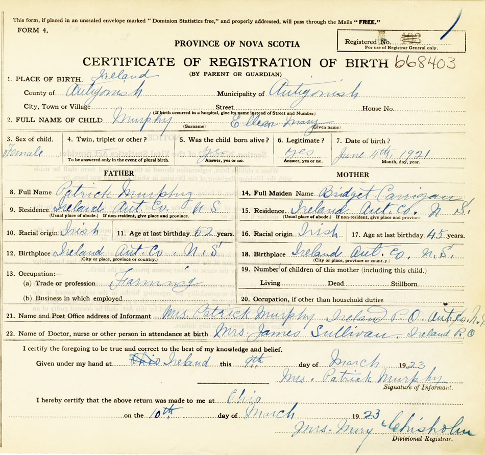 12. Birthplace Ireland, Antigonish County