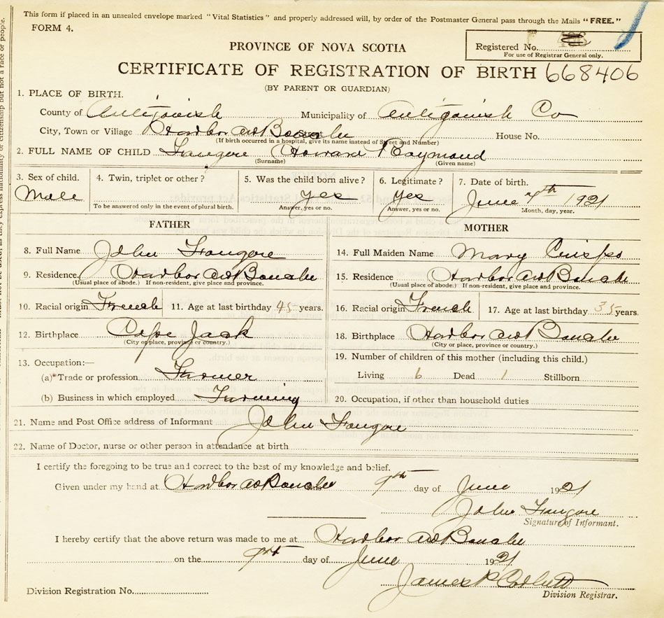 21. Name and Post Office address of Informant John Fougere Harbour au Bouche