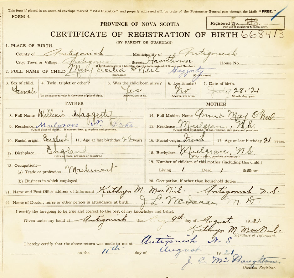 21. Name and Post Office address of Informant Kathryn M. MacNeil Antigonish, N S