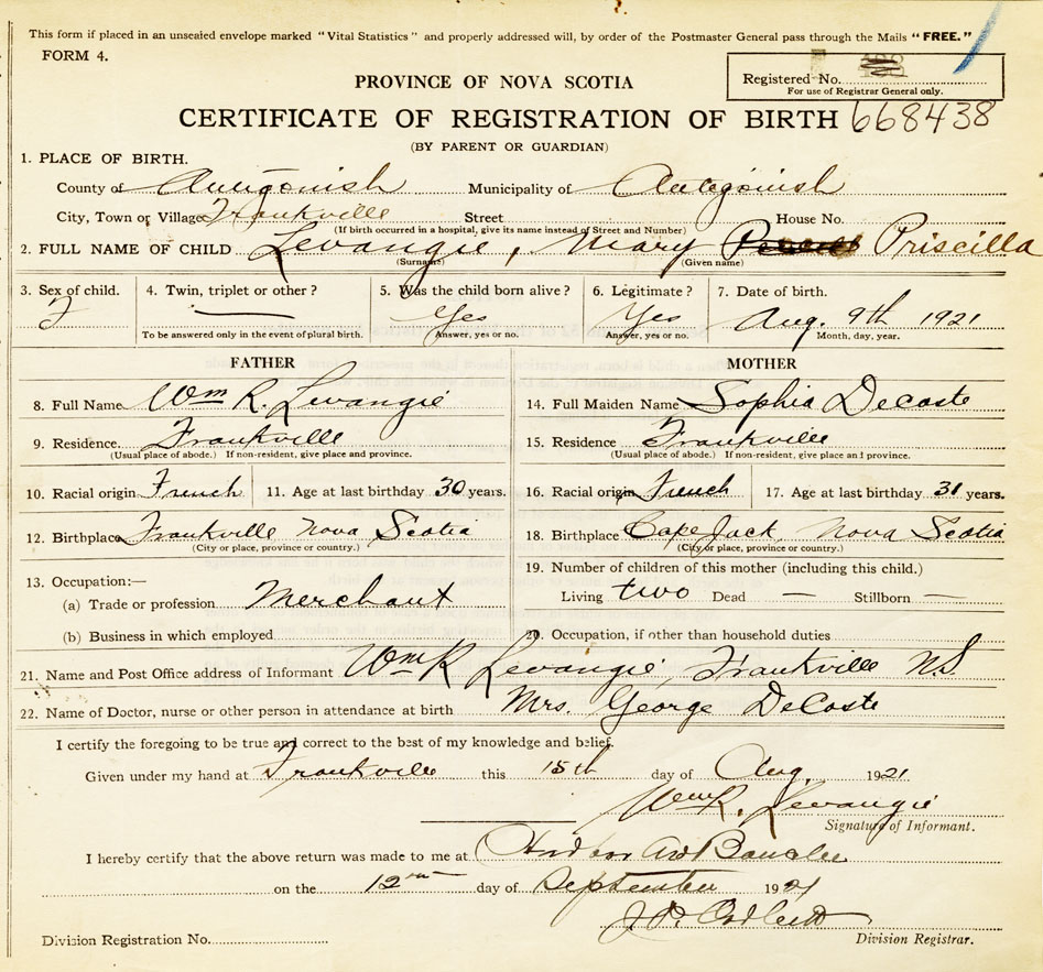 21. Name and Post Office address of Informant Wm R Levangie Frankville N.S.