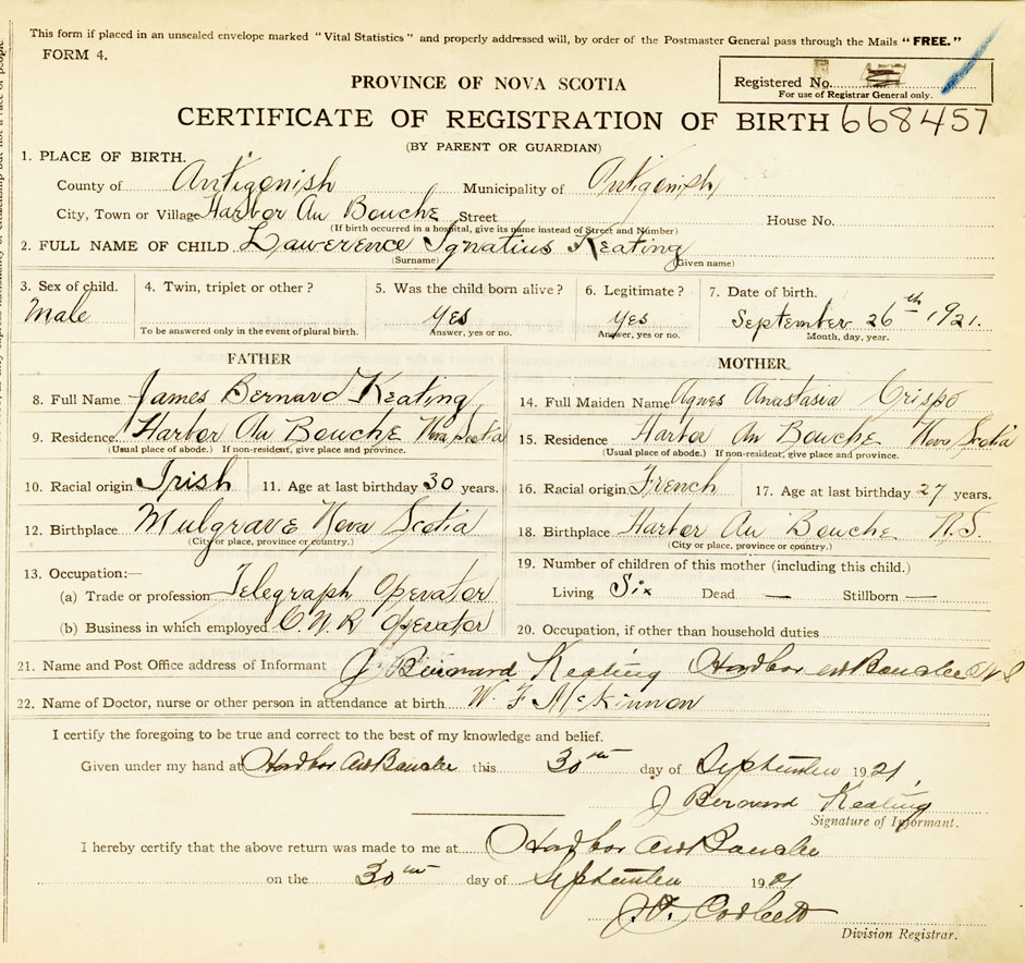 21. Name and Post Office address of Informant J. Bernard Keating Harbor Au Bouche