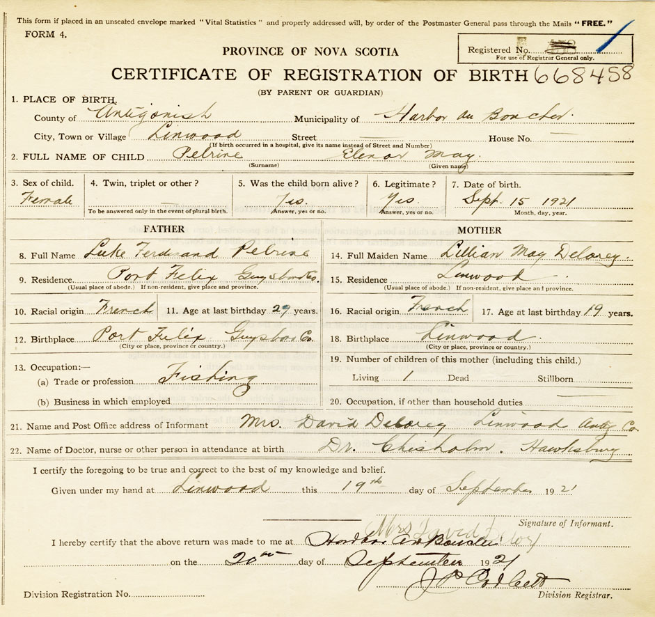 21. Name and Post Office address of Informant Mrs. David Delorey Linwood Antigonish