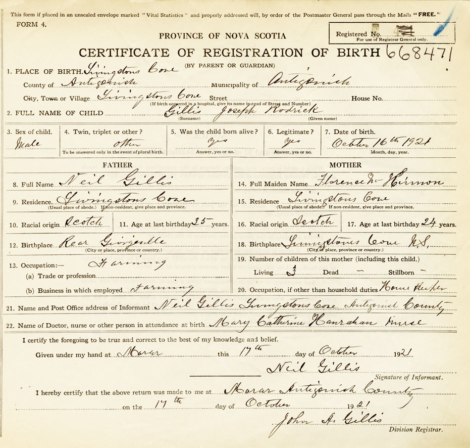 21. Name and Post Office address of Informant Neil Gillis Livingstons Cove, Antigonish County