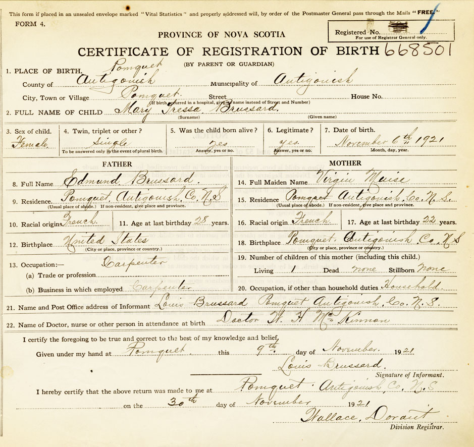 21. Name and Post Office address of Informant Louis Brussard Pomquet, Antigonish Co. N.S.