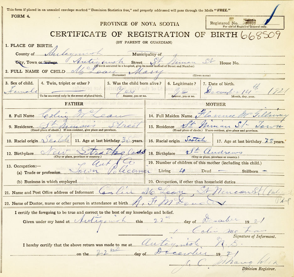 21. Name and Post Office address of Informant Colin McLean St Ninian St, Antigonish