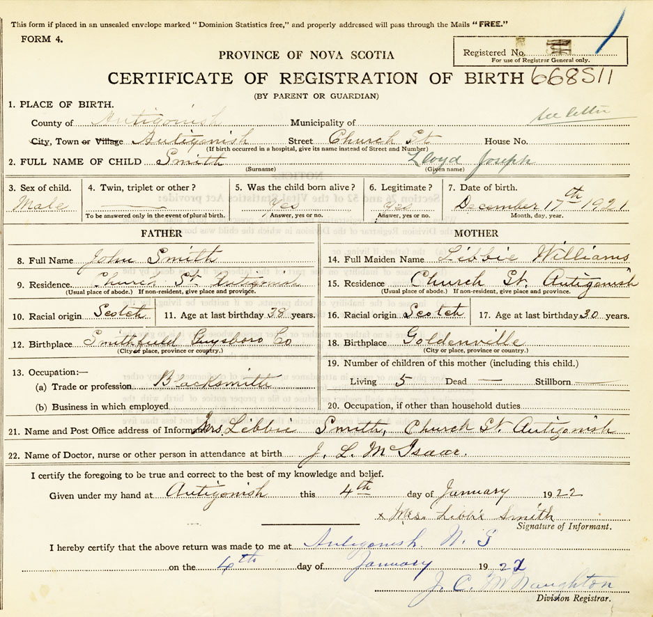 21. Name and Post Office address of Informant Mrs. Libbie Smith Church St, Antigonish