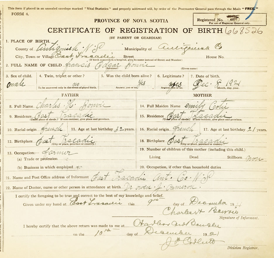 21. Name and Post Office address of Informant Charles H Bonvie East Tracadie Ant. N.S.