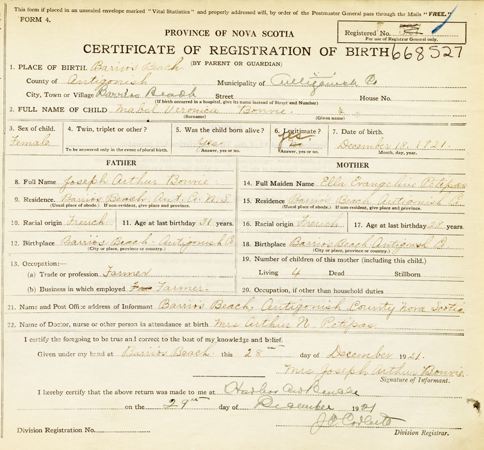 21. Name and Post Office address of Informant Mrs. Joseph Arthur Bonvie Barrios Beach, Antigonish County
