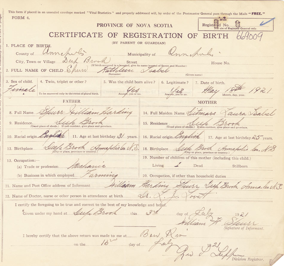 18. Birthplace Deep Brook, Annapolis Co. N.S.
