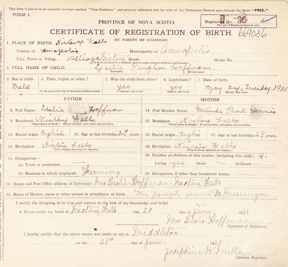 21. Name and Post Office address of Informant Mrs Leslie Hoffman Nictaux Falls