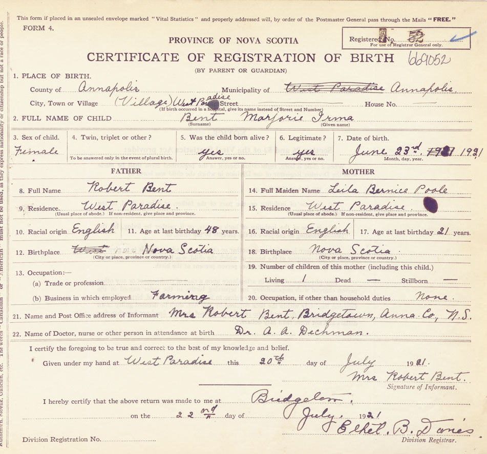 21. Name and Post Office address of Informant Mrs. Robert Bent Bridgetown, Anna
