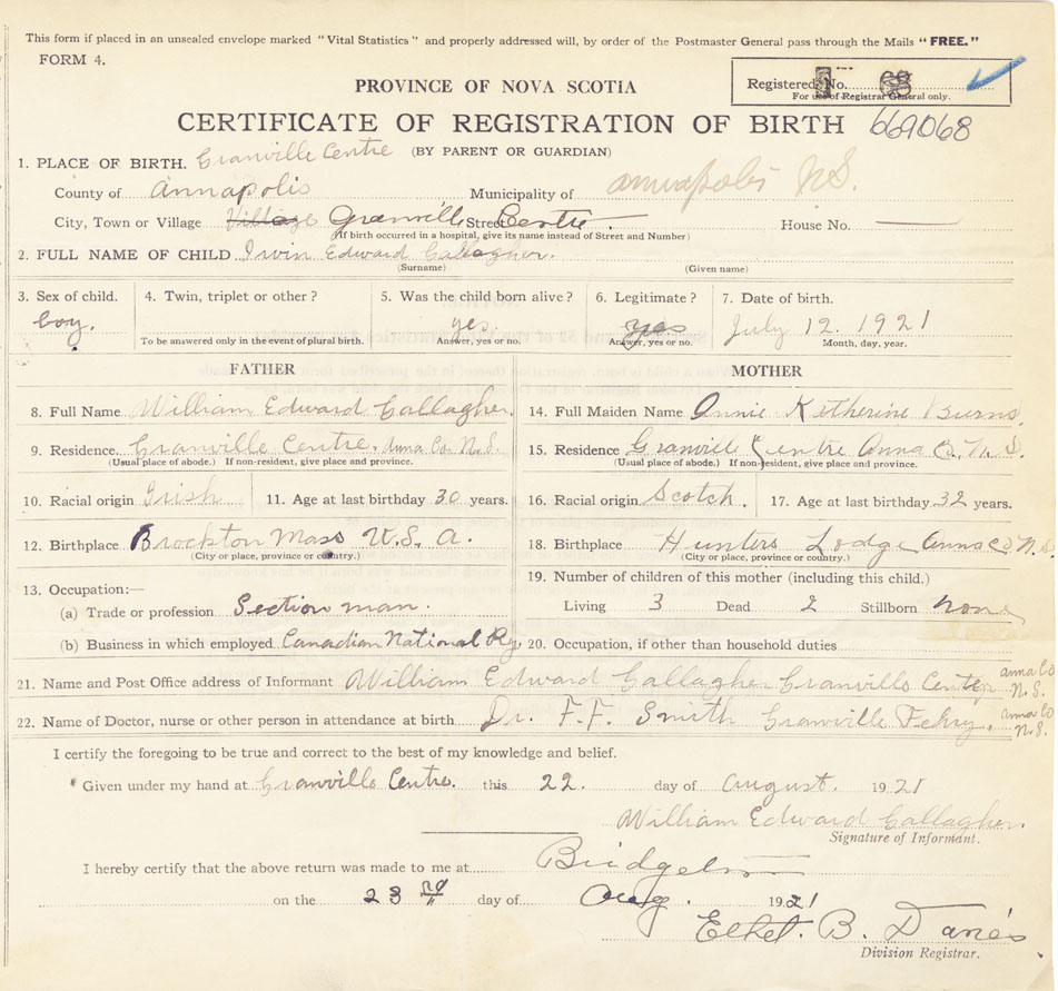21. Name and Post Office address of Informant William Edward Gallagher Granville Centre, Anna. N.S.