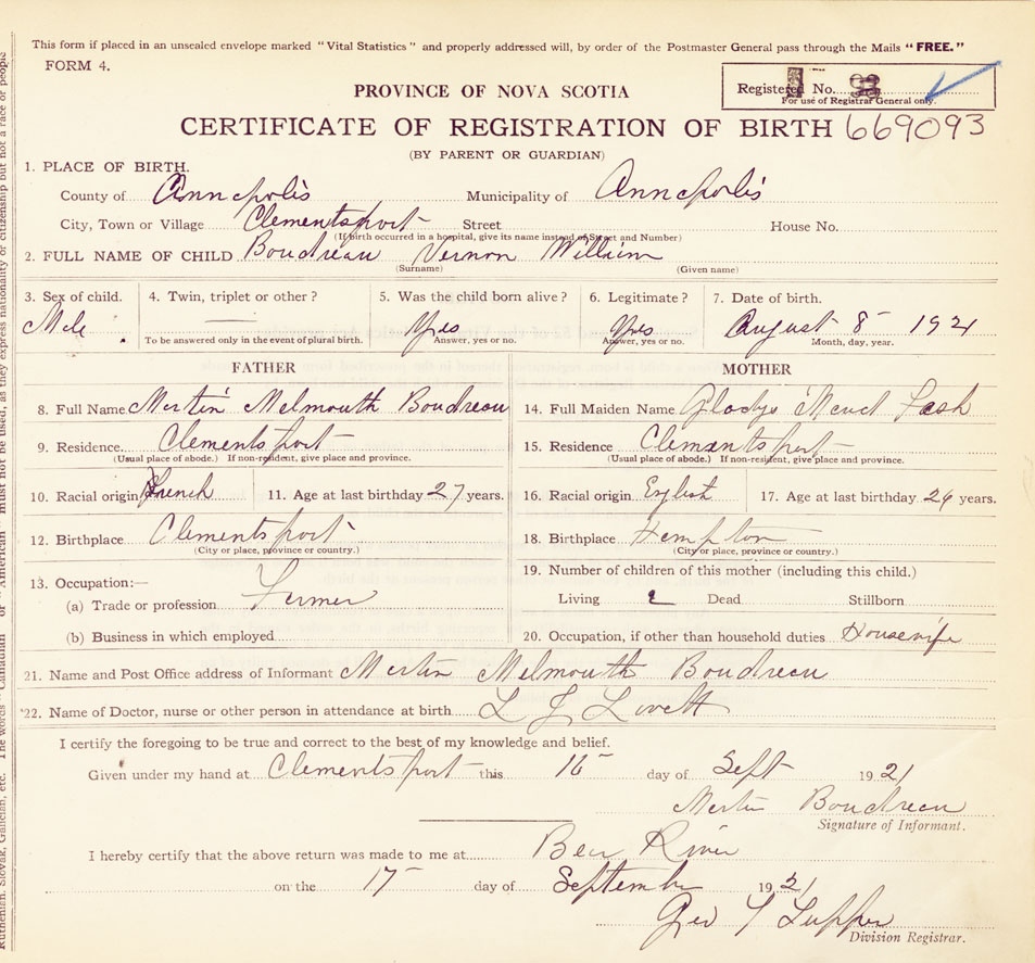 2. FULL NAME OF CHILD Boudreau, Vernon William